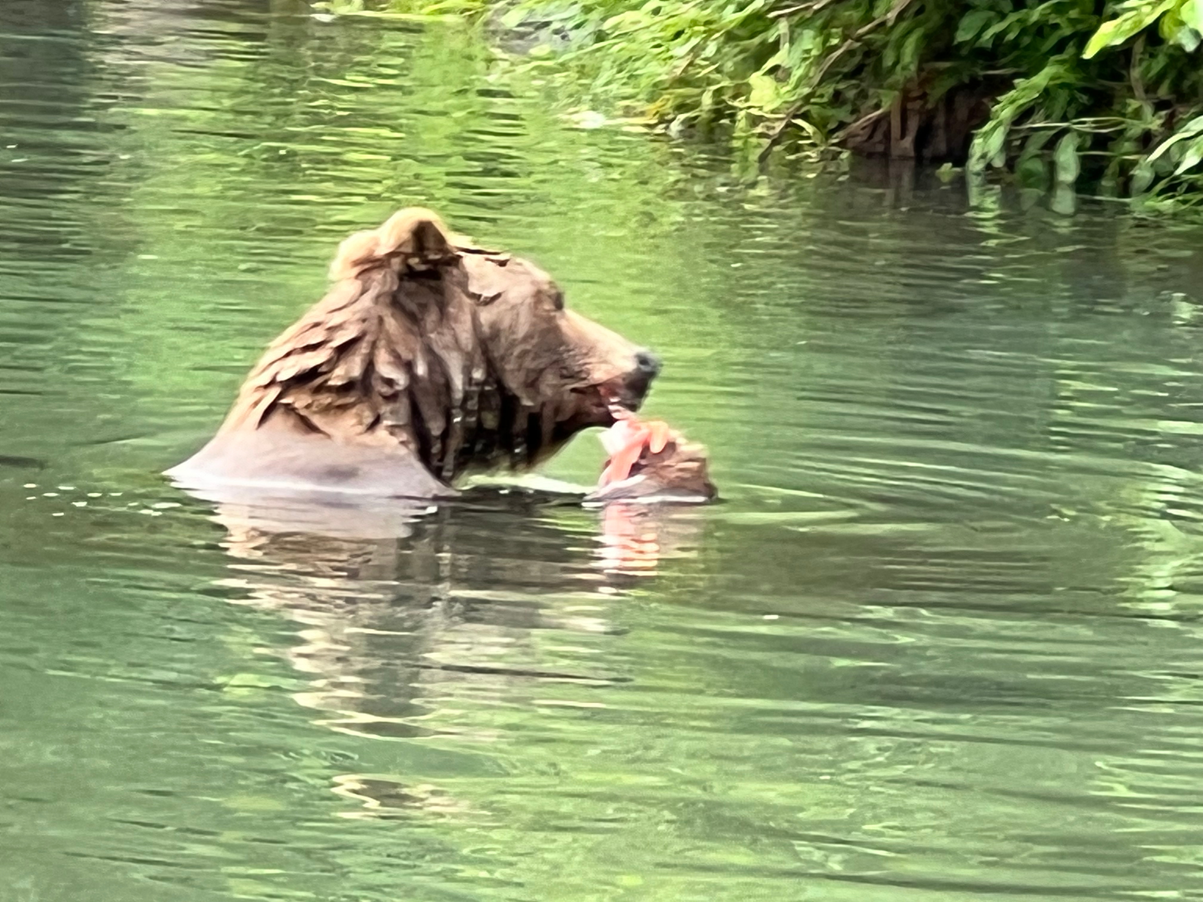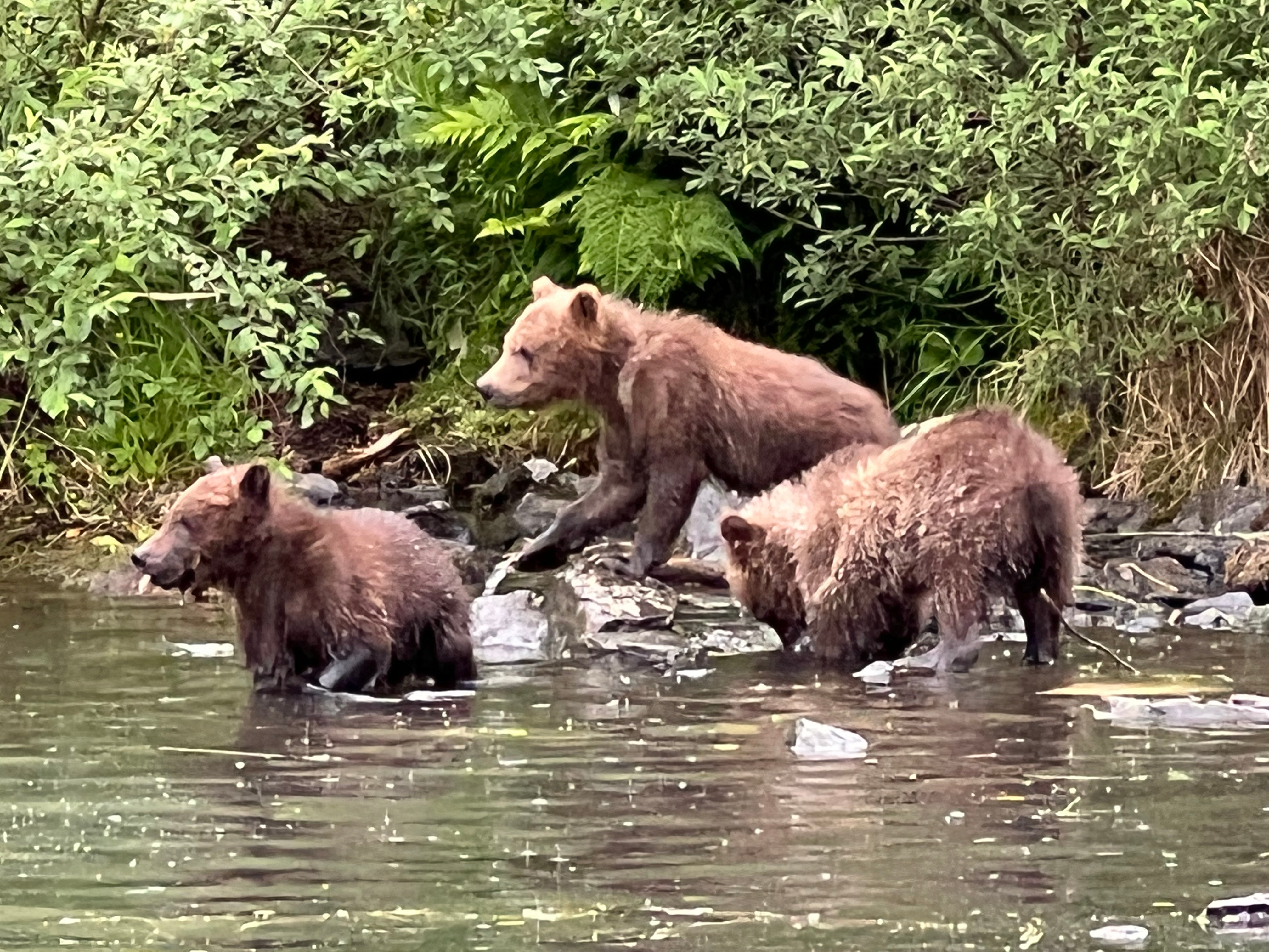We took a seaplane to Wolverine Creek the next day to fish for salmon with the bears. When we arrived, one bear was already happily eating salmon less than 10 feet from where we stopped our boat. I caught my limit of two salmon in less than an hour. Just as I was reeling in my second fish, a mama bear and three cubs came down to the water. The cubs played on the shore as mama fished for her babies.
